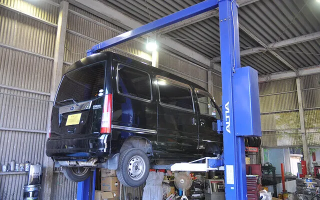 カーリフトは2基完備しており、なかなか目の届かない車体下回りまでしっかりチェックいたします。業務の効率化のためにも効果を発揮しスムーズな作業を実現しています。